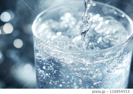 グラスに注ぐミネラルウォーターと弾ける水滴_