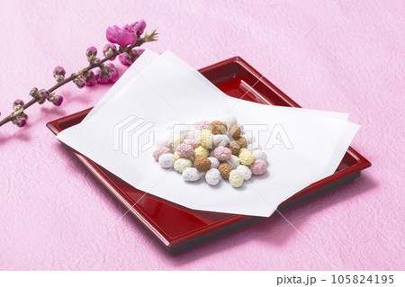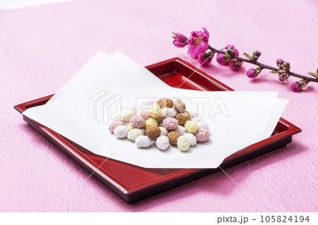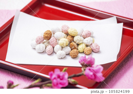 和菓子とももの花 和紙にのせた五色豆 縁起物の和菓子 イメージ素材