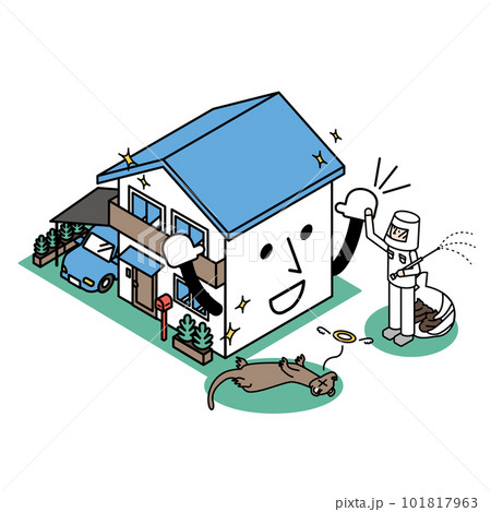 害獣のテンの駆除をおこなった一軒家のアイソメイラスト