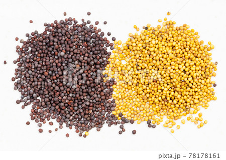 piles of yellow and brown mustard seeds on gray