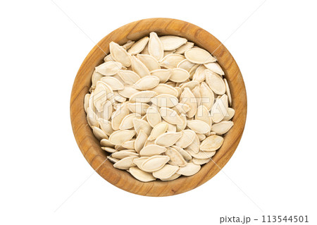 White pumpkin seeds in a plate, top view. Isolated on white background.