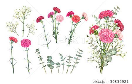 Red carnation floral set. Crimson flowers with leaves and stems. Botanical illustration isolated on