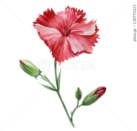 Red carnation watercolor flower with two buds on slender stem isolated on white for floral stationery wedding bouquet design