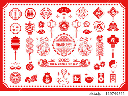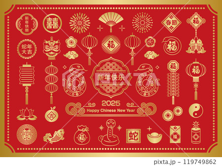 2025年中国の蛇年と旧正月の装飾とアイコンのイラスト セット