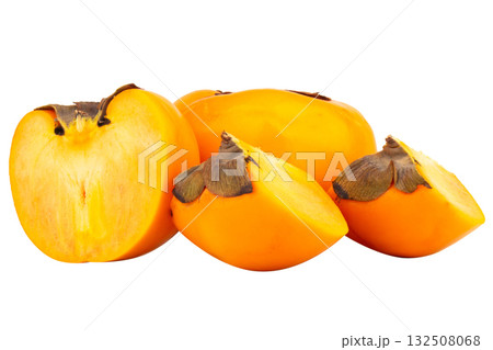 Pile of fresh ripe plums cut in half showing juicy flesh and seeds isolated on white background