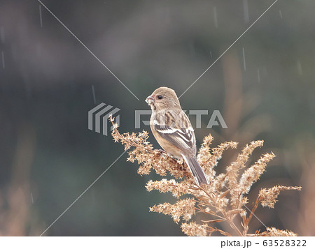 梅田川に自生する枯草に降り立ったメスのベニマシコ