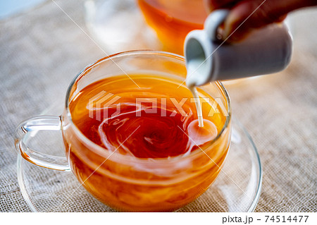 Pouring milk into cup with aromatic tea.
