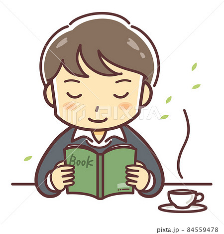 読書をする若い男性のイラスト(男の子・紅茶・コーヒー)