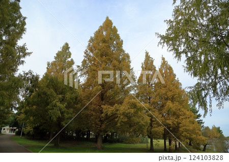 秋の公園 色づく メタセコイアの木