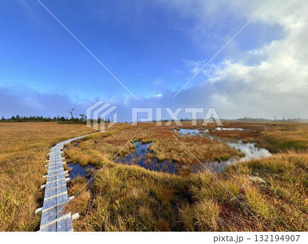 紅葉の尾瀬ヶ原の木道と燧ヶ岳