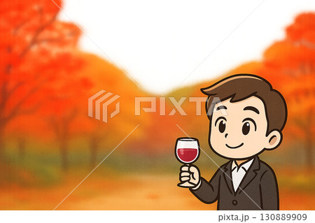 紅葉の下でグラスを持つミニキャラ男性の飲み会イラスト