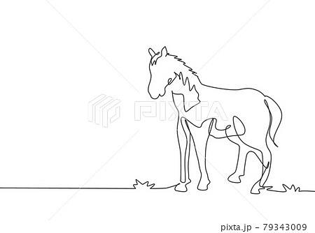 Continuous one line drawing a horse standing firmly on the pasture. Successful livestock business run by professional farmers. Minimalism concept. Single line draw design vector graphic illustration.