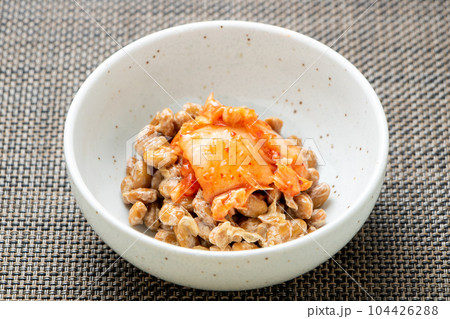 納豆アレンジ「キムチ納豆」(白菜キムチトッピング極小粒納豆)。(白バック)