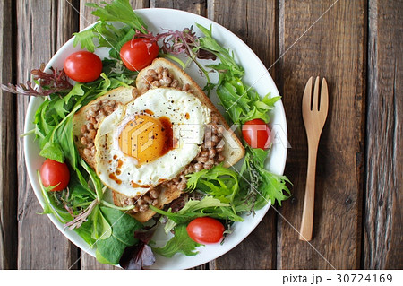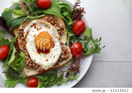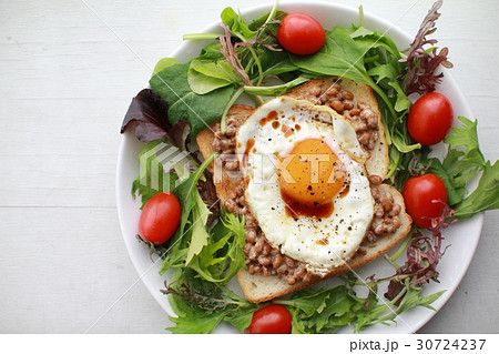 目玉焼をのせた納豆トーストと野菜サラダ オープンサンド
