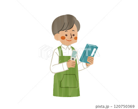 本とハンディターミナルを持っているエプロンを着用した男性-ガッシュ