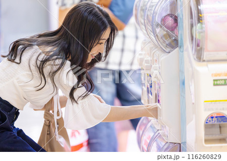 カプセルトイを楽しむ若い女性