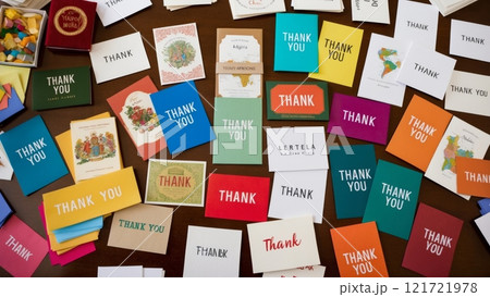 A large number of colorful postcards with the word "Thank You," creating a vibrant and cheerful composition.