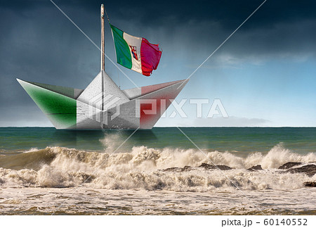 Paper boat with Italian flag in a rough sea and rainy sky