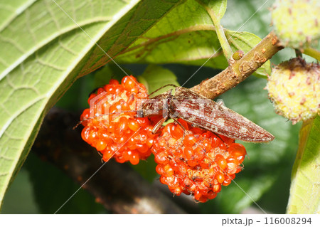 ヒメコウゾの実に止まるヒゲコメツキ(メス)