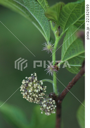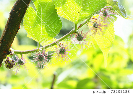 自然 植物 コウゾ、薄赤色の糸の様な花柱が目立つ雌花序と白いつぶつぶの雄花序