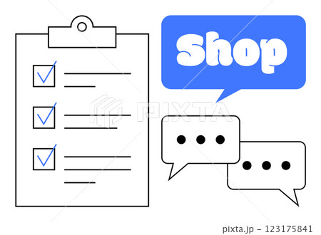 A clipboard with checkmarks, a speech bubble with the word Shop, and two chat bubbles with ellipses. Ideal for business planning, customer service, shopping, communication, and task management