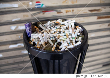 灰皿いっぱいの紙巻きたばこの吸い殻のクローズアップ