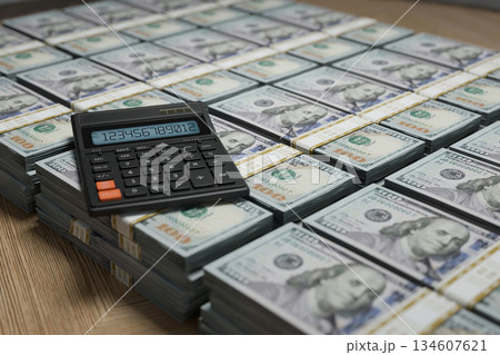 Stacks of hundred-dollar bills with a calculator on top. Finance, investment, banking, savings, and wealth management. Perfect for illustrating money, accounting, or business success concepts