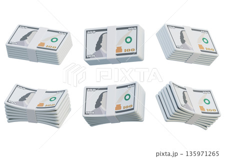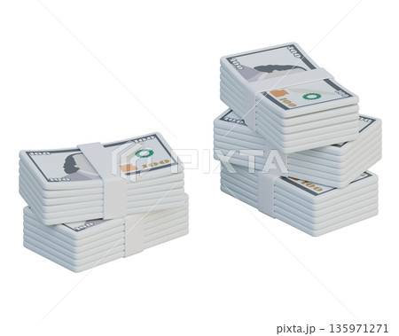 Stacked bundles of 100 US dollar banknotes in cartoon 3D style