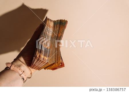 Hand holding a thick stack of Kazakhstani tenge banknotes on beige background with hard shadow, cash concept