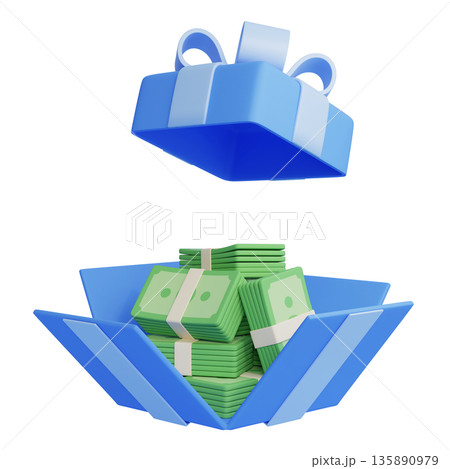 3D cartoon gift box overflowing with bundles of money