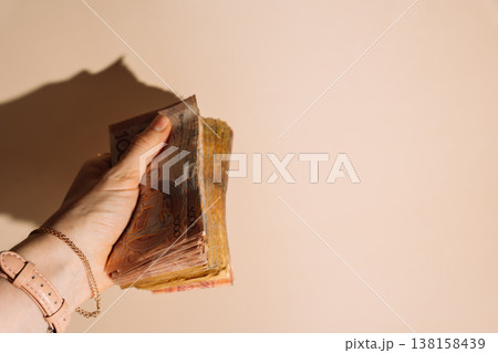 Close up hand holding Kazakhstani tenge banknotes on beige background with sunlight shadow, savings concept