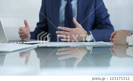 Business partners or lawyers dressed in blue are reviewing and discussing contract papers during a meeting, using a laptop and documents on a glass table. Businesspeople