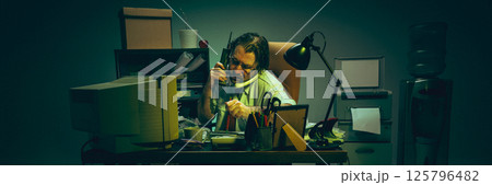 Man buried in documents, balances two phones while working under lamp in cluttered office, expressing burnout, fatigue, pressure.