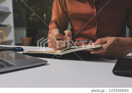 Working from home, Closeup business woman using laptop computer and analyzing financial report.