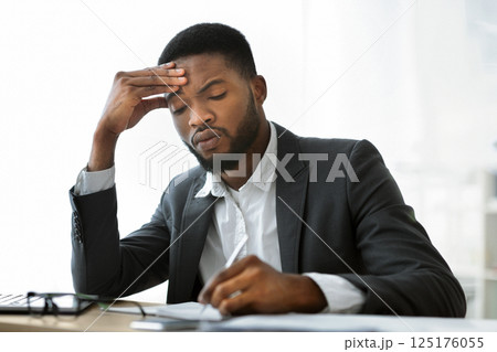 Busy afro businessman filling paperwork at workplace in modern office, free space