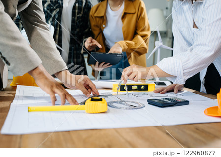 Engineer desk with object paper and tablet with blurry engineer teamwork hardworking