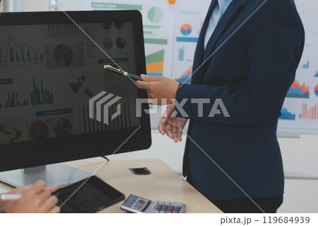 Close up of two professional businesspeople discussing a report with graphs and charts in modern office