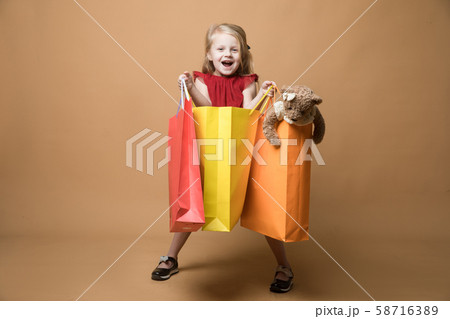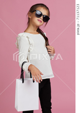 child girl in sunglasses is holding shopping bags