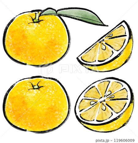 柚子の墨彩画風のイラスト素材セット