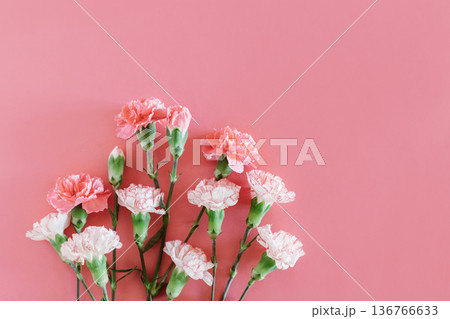Beautiful pink and white Carnation flowers on a pink pastel background.