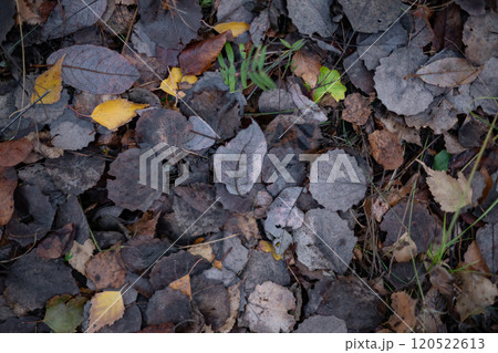 Close-up of autumn leaves on city street. Warm colors and seasonal texture