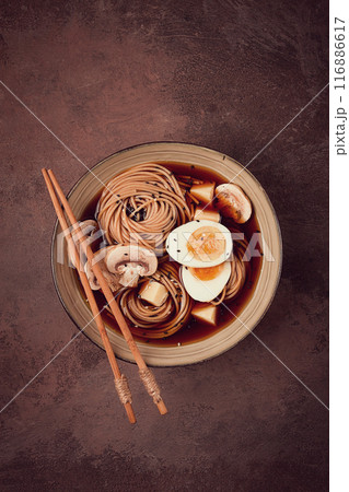 Asian soba soup, with mushrooms and egg, cheese, sesame seeds, homemade, no people,