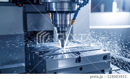 Spindle cutting tool Rotary 5-axis CNC milling machine during deburring of engine parts, heavy industry plan