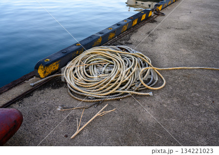 港のコンクリートに置かれた太いロープ