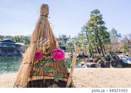 わら囲い(ワラボッチ)の冬牡丹(紫紅殿)