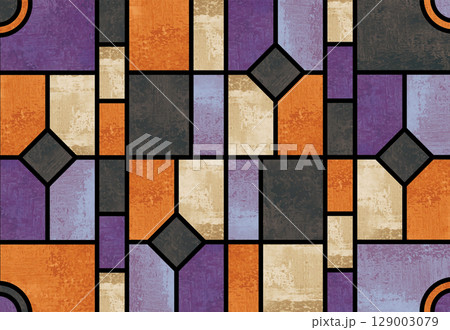 Halloween abstract modern geometric pattern, creative vector ornament features vibrant orange, white or purple colors and spooky elements such as skull, pumpkin, ghost and bat, cat or spider web