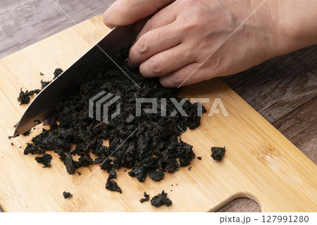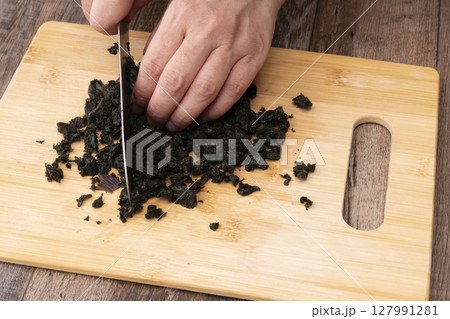 赤紫蘇のシロップを作った紫蘇がらでふりかけを作る工程 生姜のみじん切り