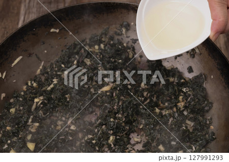 赤紫蘇のシロップを作った紫蘇がらでふりかけを作る工程