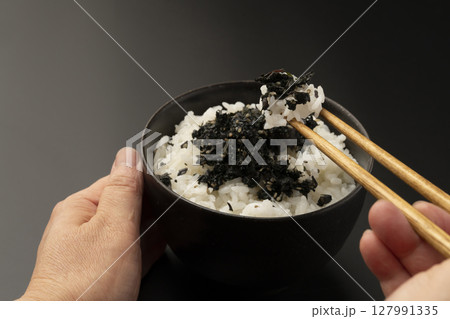 赤紫蘇のシロップを作った紫蘇がらでふりかけをご飯にかける