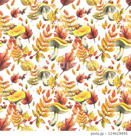 Autumn rowan leaves, maple, birch, russula mushrooms, tree branches and ladybugs. Watercolor illustrations. Seamless pattern on a white background